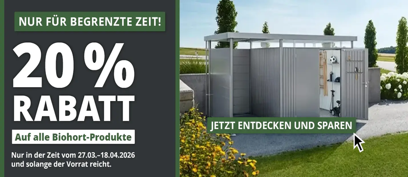 Biohort Gerätehäuser, Gartenboxen, Fahrradgaragen u.v.m. aus Metall überzeugen durch höchste Qualität und Langlebigkeit. Sichern Sie sich bis zum 18.04.2026 satte 20% Rabatt auf alle Biohort-Artikel.